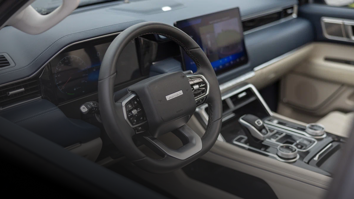 Интерьер FOTON TUNLAND V7 выглядит нарядно. Он может быть только двухцветным, но зато в трёх вариантах на выбор: чёрный с коричневым, коричневый с оранжевым и синий с белым (как на фотографии)