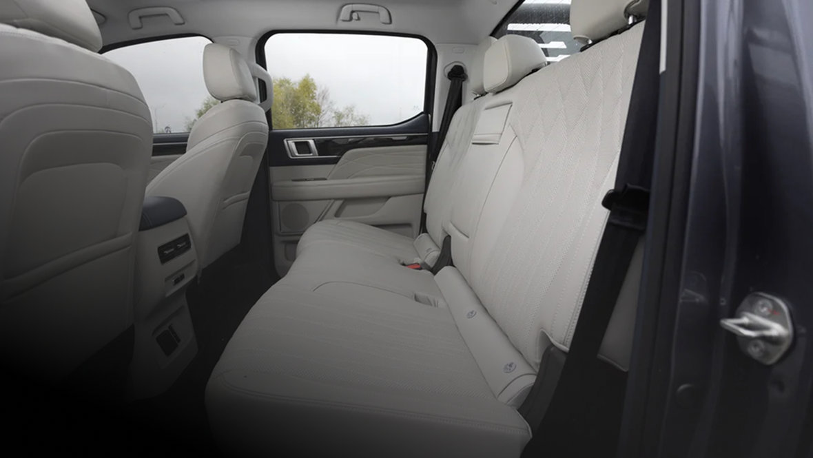 Порадовала достаточно удобная посадка. Руль настраивается как по углу наклона, так и по вылету, у сиденья — удачные плотность набивки и профиль, есть регулировка поясничного подпора и полный набор электроприводов. Длина подушки традиционно для китайских автомобилей маловата, но это особо не мешает. Да и с обзорностью нет никаких проблем: габариты массивного пикапа хорошо чувствуются, а огромные зеркала заднего вида очень помогают.
