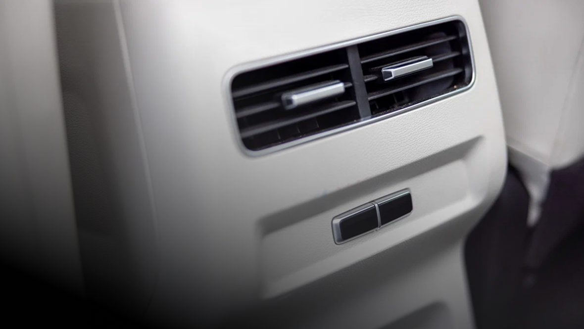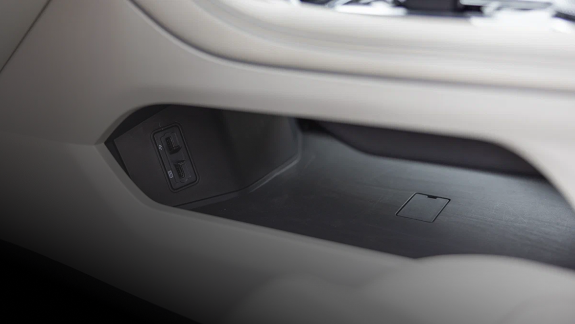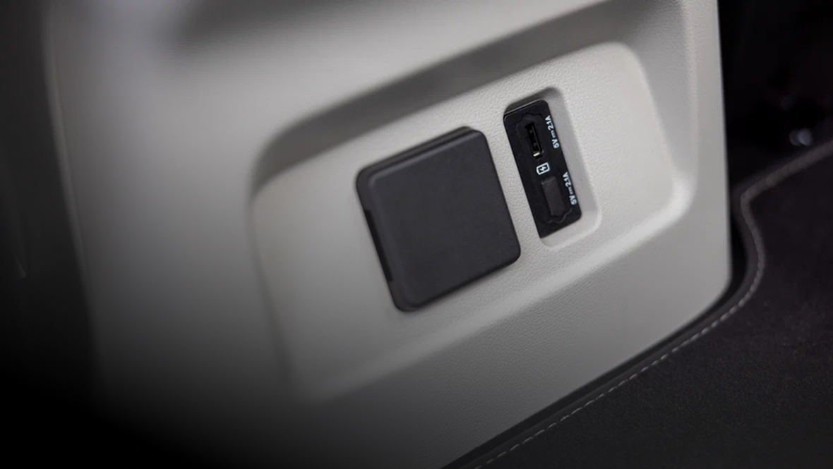 Также для задних пассажиров предусмотрены газетные карманы, крючки для одежды, потолочный светильник и два USB-порта. Подогрева дивана нет, хотя заглушки под кнопки на виду. Ещё одна пластиковая накладка находится на том месте, где должна быть 220-вольтовая розетка — она есть в списке опций.