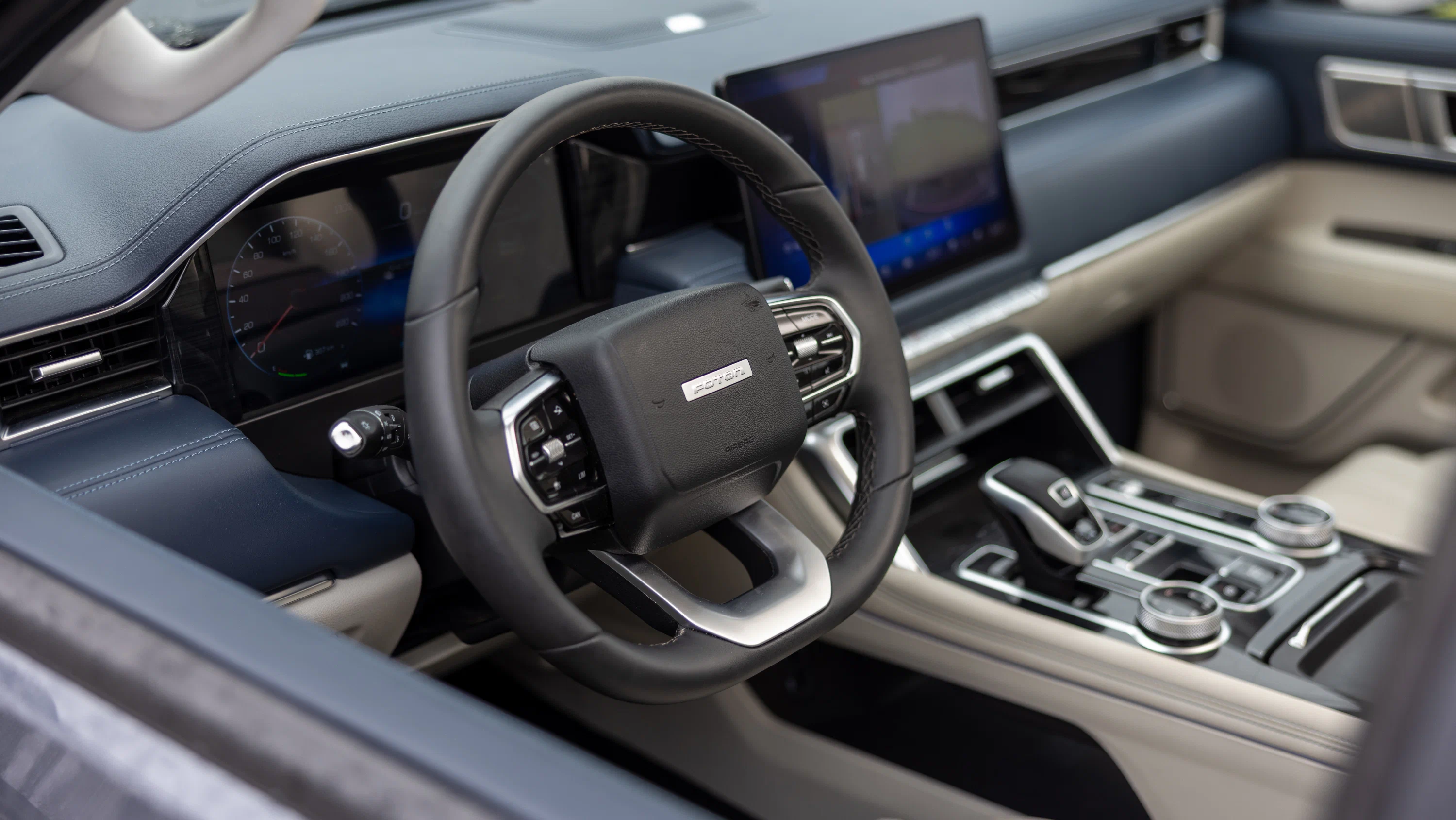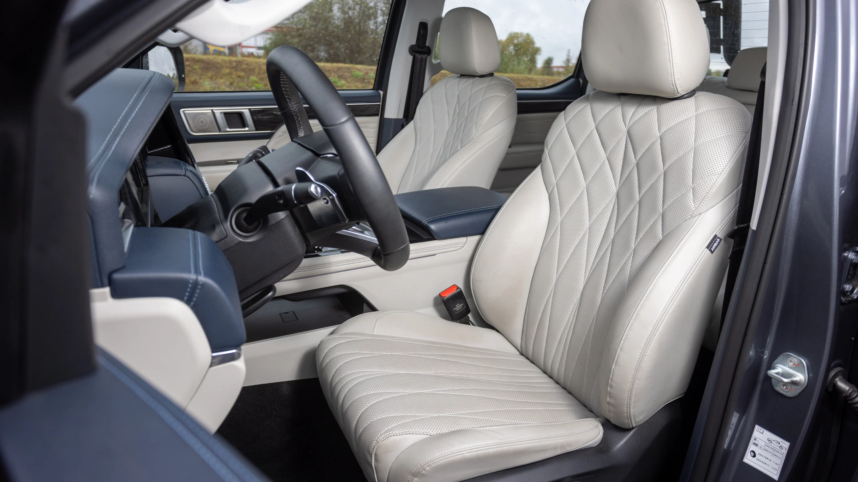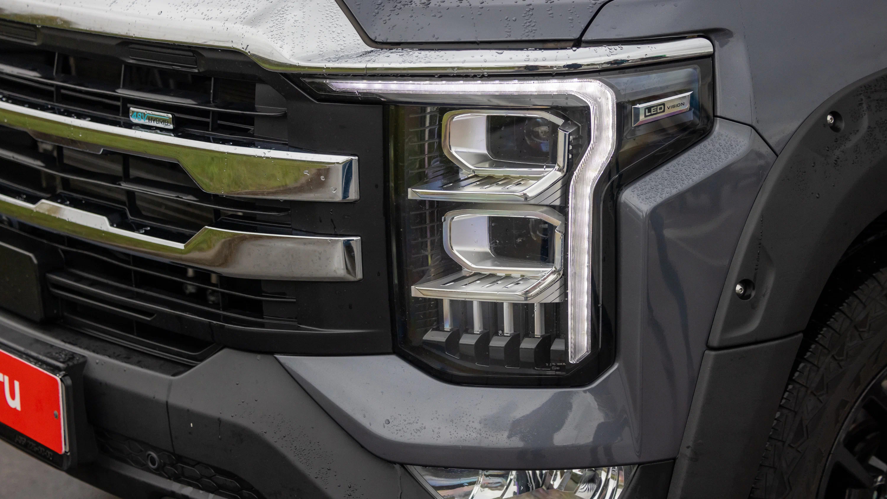 В линейке четыре пикапа, включая новинки — TUNLAND V7 и V9. Хотя за разной внешностью скрывается фактически один и тот же автомобиль: рама, кабина, агрегаты и даже интерьер практически одинаковые, различия сводятся к оснащению. Но если прежние Тунленды были простыми, непритязательными рабочими лошадками, то нынешние модели шагнули почти в полноразмерный формат, претендуя на премиум, щеголяя кремовой кожей и прочими «дорогими» опциями.