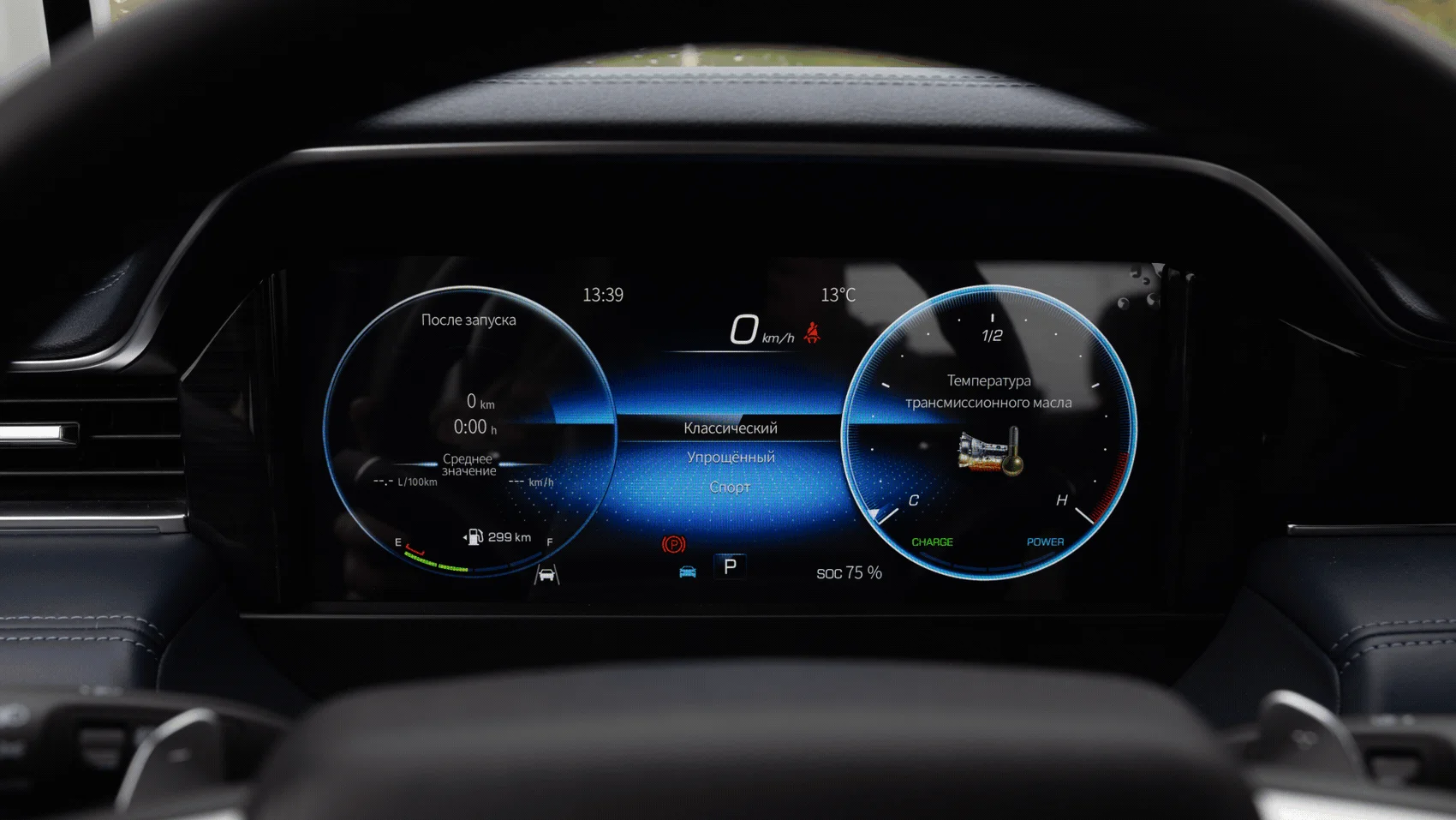 Вокруг — современно. Главные элементы интерьера — большие экраны. Цифровая приборная панель диагональю 12,3 дюйма выглядит симпатично, каждый из трёх информационных блоков можно настроить по своему желанию. Но графикой и прорисовкой борткомпьютера система явно пародирует Mercedes-Benz.