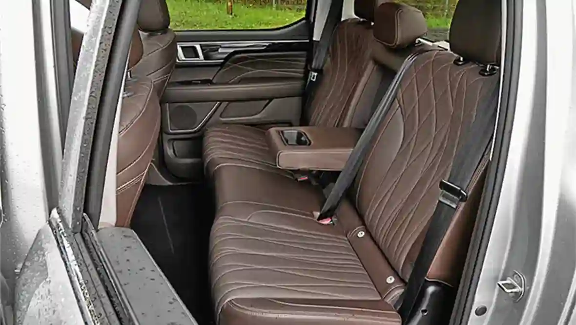 Доступ в двойную кабину (об интерьере пикапов принято говорить именно так) удобен. Предусмотрены мощные стальные подножки, проемы дверей — широкие, на всех стойках мощные поручни. Затем ты проваливаешься в мягкие кожаные сиденья с развитой боковой поддержкой и не хочешь вылезать. Оба передних кресла имеют массу электрорегулировок, подогрев и вентиляцию, а также функцию памяти на три положения. Диван по меркам пикапов — сверхудобен. Спинка достаточно сильно наклонена, пол ровный, а поскольку габаритная высота — под два метра, даже высокие люди сидят как в амфитеатре. В их распоряжении — розетка на 220 В, пара силовых разъемов USB, дефлекторы вентиляции и клавиши многоступенчатого подогрева. А еще подушки дивана можно поднять вверх к спинкам, закрепить штатными крючками и использовать образовавшуюся нишу как дополнительное вещевое отделение.