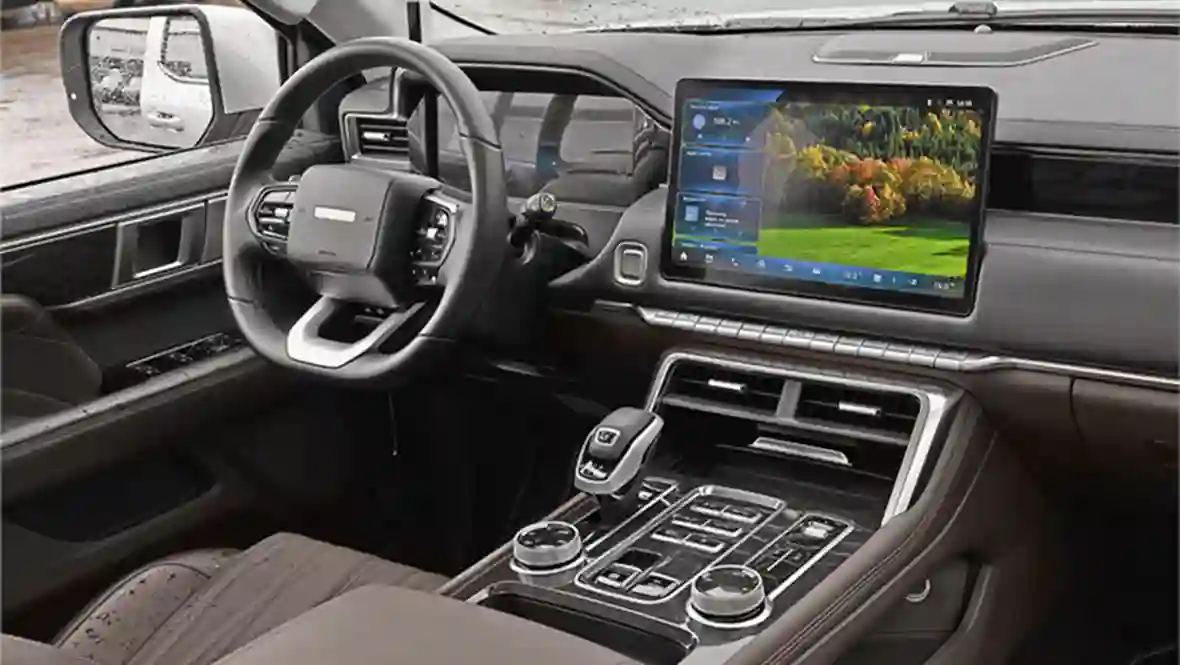 На первом ряду ощущение простора еще сильнее прежде всего из-за габаритной ширины, недоступной для других пикапов из Поднебесной. На массивном центральном тоннеле разместился обширный инструментарий из кнопок и тумблеров, а под широкоформатным 14,6‑дюймовым тачскрином раскинулось «авеню» из кнопок, в основном отвечающих за функционал «климата» и подогрева.