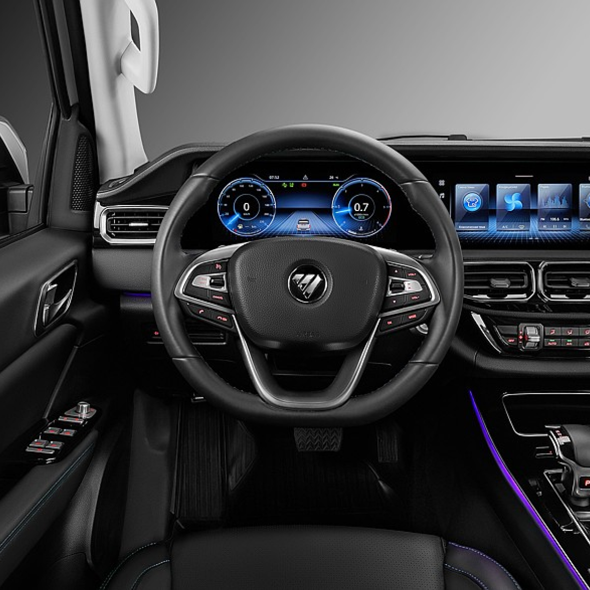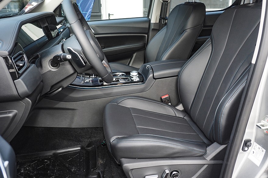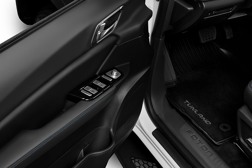 Салон TUNLAND G9 можно смело назвать мечтой традиционалиста-кнопочника: практически все значимые функции, включая климат и режимы работы раздаточной коробки, имеют отдельные физические органы управления. Отличий от G7 тут очень много: изменились материалы, больше стало дорогого мягкого пластика. Кресла водителя и переднего пассажира получили не только электрорегулировку поясничного подпора, но и систему вентиляции. На панели перед передним пассажиром – декоративная подсветка в нескольких вариантах. Классическую комбинацию с аналоговыми приборами и расположенным между ними дисплеем бортового компьютера сменил 12-дюймовый экран с несколькими вариантами вывода на него всей необходимой информации. В частности, есть версия и с «нарисованными» циферблатами спидометра и тахометра. Тачскрин головной медиасистемы реализован не в виде отдельно торчащего планшета, а объединен общим козырьком с приборным экраном.