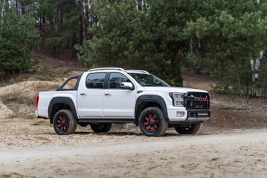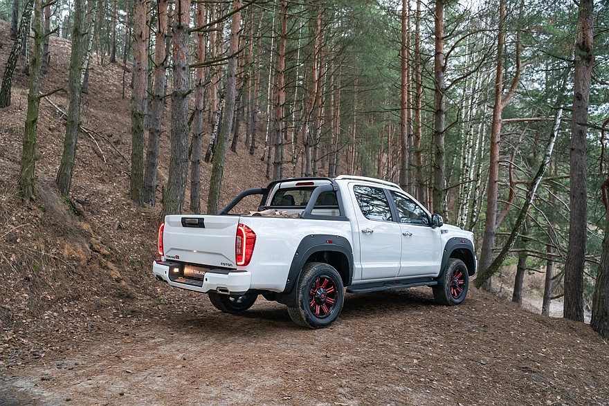 Новый среднеразмерный пикап TUNLAND G9 не предназначен для замены модели G7 –это своего рода дополнение, которое устранит некий прогал между G7 и более крупными V7 и V9. TUNLAND G9 построен на той же платформе P3, что и G7, и с технической точки зрения практически ничем не отличается. G9 стал на 20 мм шире и на 50 мм выше, но общая длина и колесная база остались прежними (5340 мм и 3110 мм соответственно). Под капотом – все тот же двухлитровый турбодизель Aucan 4F20TC мощностью 163 л.с., в паре с которым работает 8-ступенчатая гидромеханика ZF 8HP50. В трансмиссии – точно такая же раздаточная коробка BorgWarner с режимами 2H, 4H, Auto и 4L (понижающая передача имеет солидное передаточное число 2,48). Передняя подвеска – независимая пружинная, на двойных А-образных рычагах, сзади – неразрезной мост на полуэллиптических рессорах. Можно сказать, классика жанра. Да и вообще, похоже, разработчики подумали, что от добра добра не ищут, и оставили без малейших изменений те технические решения, которые уже успели хорошо себя зарекомендовать, включая самоблокирующийся дифференциал Eaton Detroit Locker в заднем мосту. А вот изменений в экстерьере и интерьере хватает.
