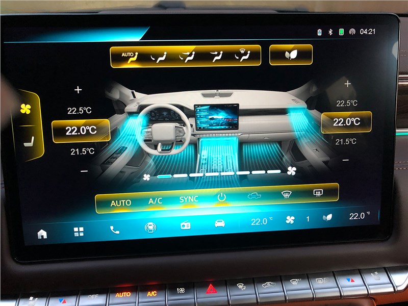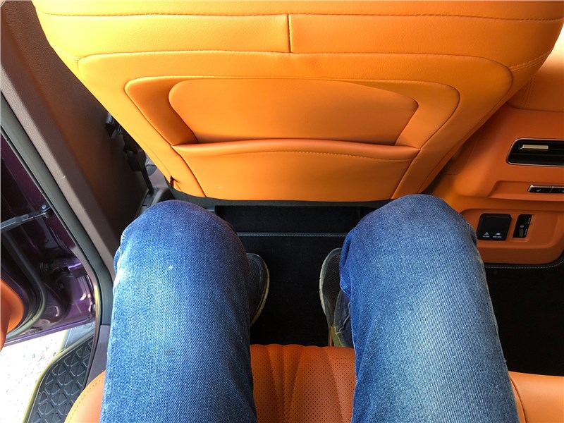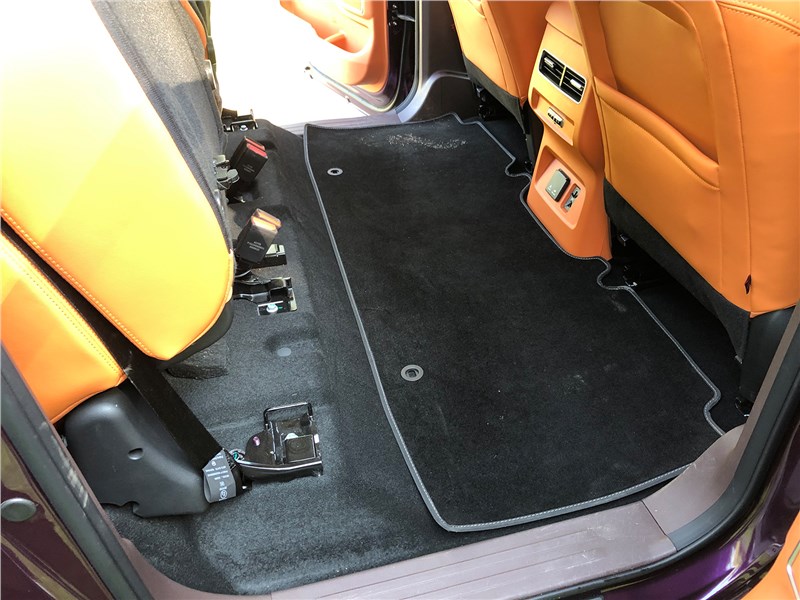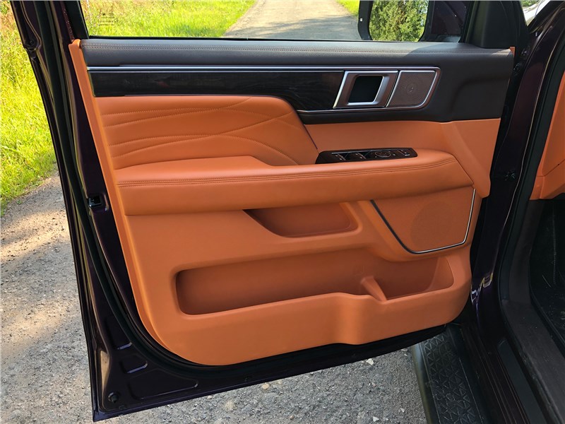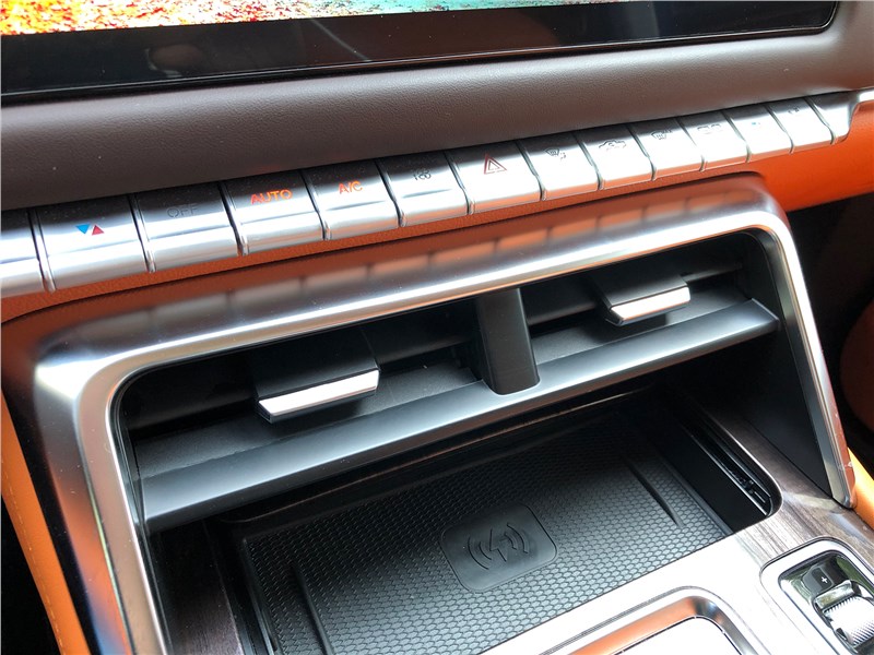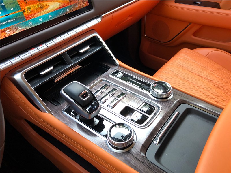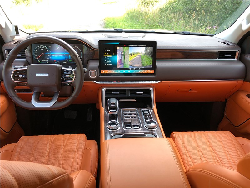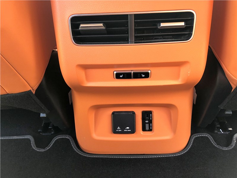 Салон V9 отделан ярко-рыжим кожзамом, поэтому сразу выглядит очень дорогим. Хотя принципиальных отличий от V7 нет. Те же массивные ручки на стойках, тот же «американский» простор, та же широкая центральная консоль, отделанная под темный древесный шпон. Но кожзам с перфорацией и ромбовидной прострочкой, которым обиты широкие сиденья, кажется, более мягким, чем в V7. Подогревы, вентиляция передних кресел – но почему-то нет подогрева руля. Над головой панорамная крыша, в V7 ее не было. Те же два дисплея – приборная панель и экран мультимедиа, с картинкой, графикой и шрифтами а-ля Mercedes-Benz. Регулировки климата – и через экран, и частично кнопками. Естественно, есть поддержка Apple CarPlay, беспроводная зарядка. Так же в нише под центральной консолью обнаруживается не только USB-разъем, но прикуриватель в розетке 12V, а в один из подстаканников вставлена пепельница с плотной крышкой. На втором ряду сидений – знакомый уже по V7 простор в ширину и длину, раздельные подогревы. И даже есть розетка на 220 вольт.