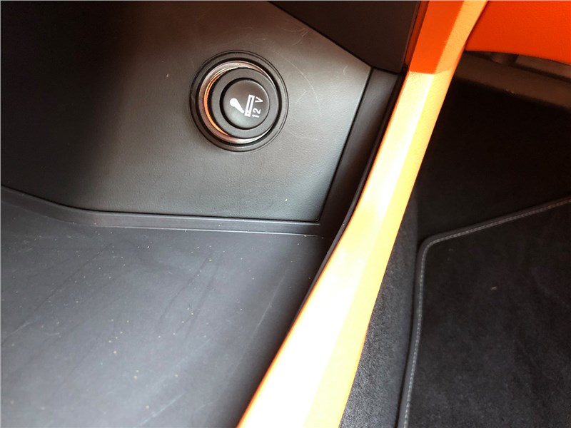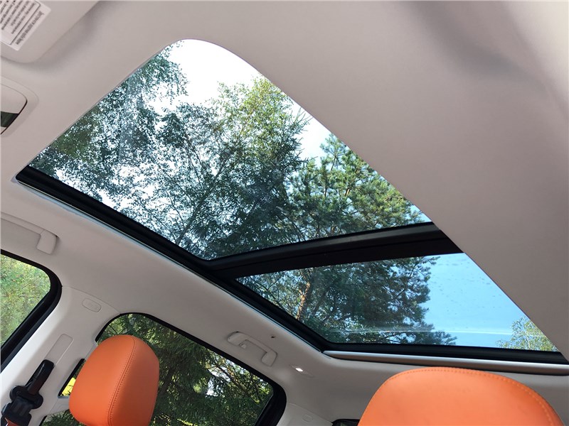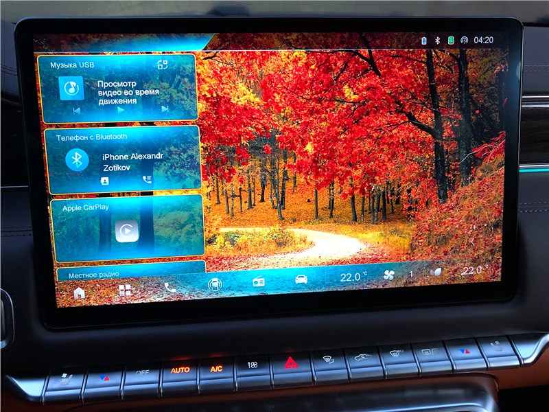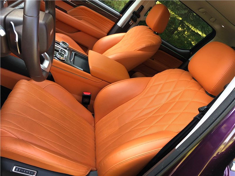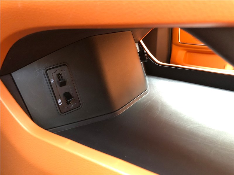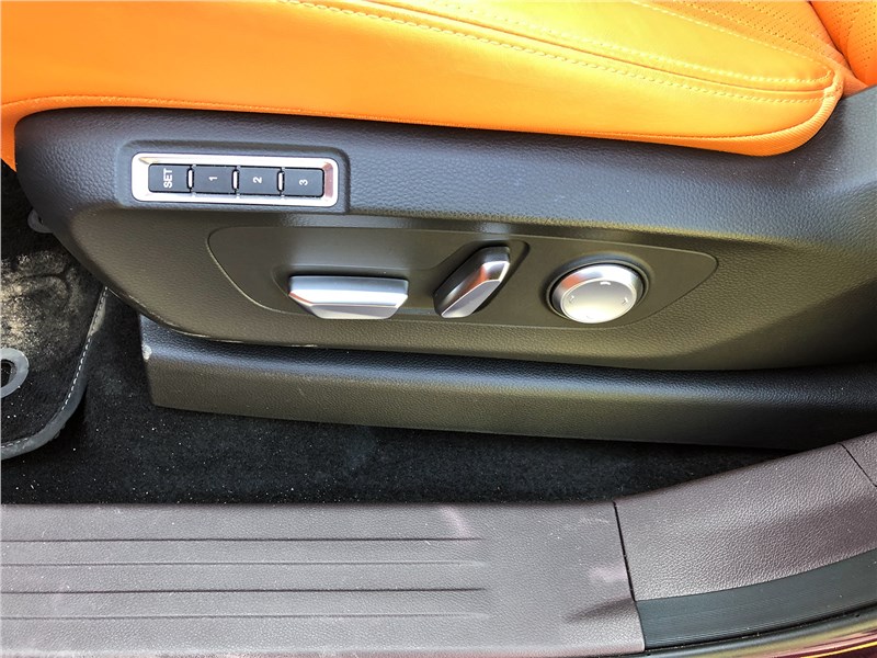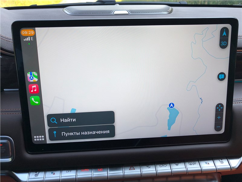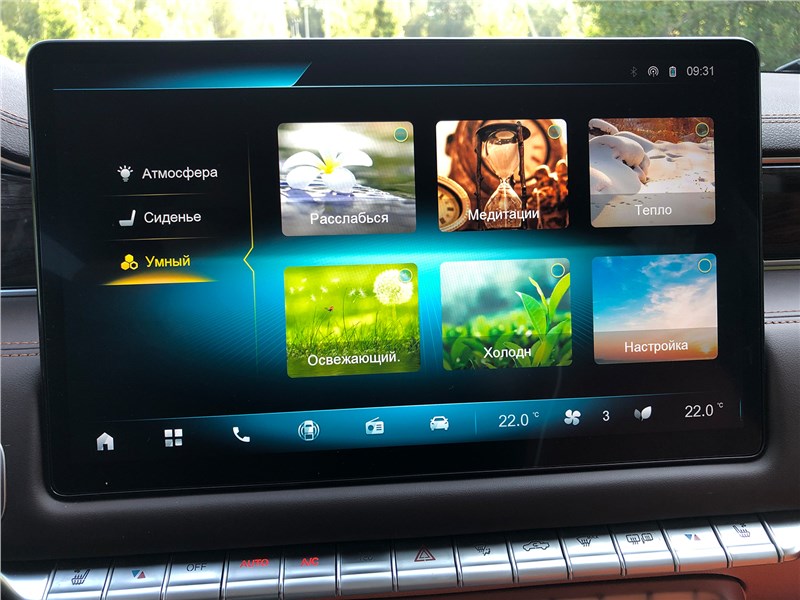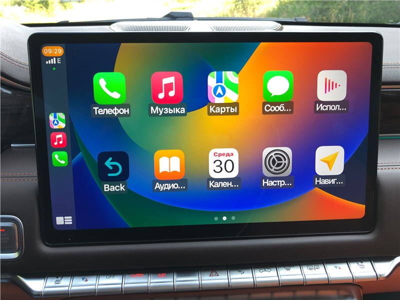 Салон V9 отделан ярко-рыжим кожзамом, поэтому сразу выглядит очень дорогим. Хотя принципиальных отличий от V7 нет. Те же массивные ручки на стойках, тот же «американский» простор, та же широкая центральная консоль, отделанная под темный древесный шпон. Но кожзам с перфорацией и ромбовидной прострочкой, которым обиты широкие сиденья, кажется, более мягким, чем в V7. Подогревы, вентиляция передних кресел – но почему-то нет подогрева руля. Над головой панорамная крыша, в V7 ее не было. Те же два дисплея – приборная панель и экран мультимедиа, с картинкой, графикой и шрифтами а-ля Mercedes-Benz. Регулировки климата – и через экран, и частично кнопками. Естественно, есть поддержка Apple CarPlay, беспроводная зарядка. Так же в нише под центральной консолью обнаруживается не только USB-разъем, но прикуриватель в розетке 12V, а в один из подстаканников вставлена пепельница с плотной крышкой. На втором ряду сидений – знакомый уже по V7 простор в ширину и длину, раздельные подогревы. И даже есть розетка на 220 вольт.