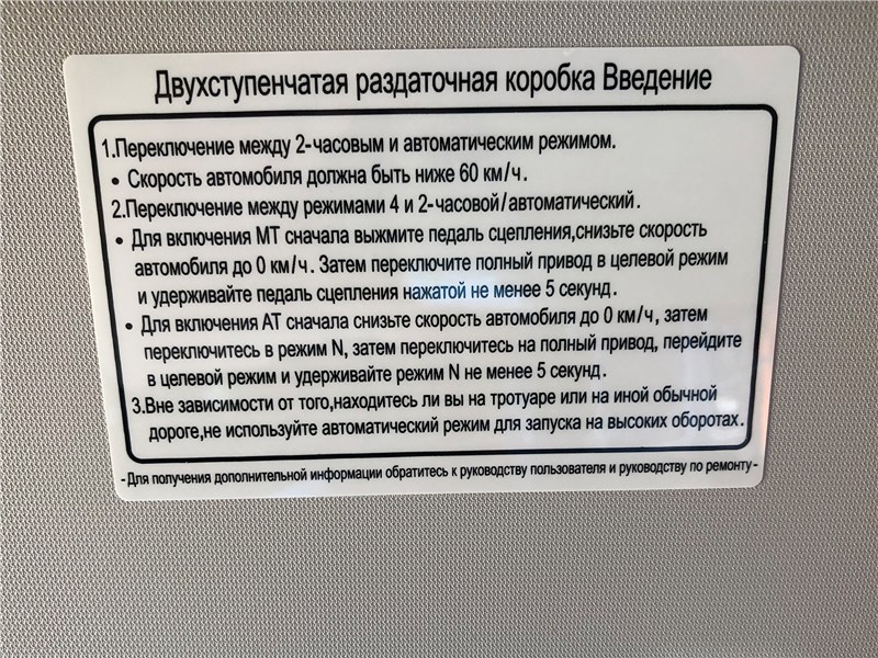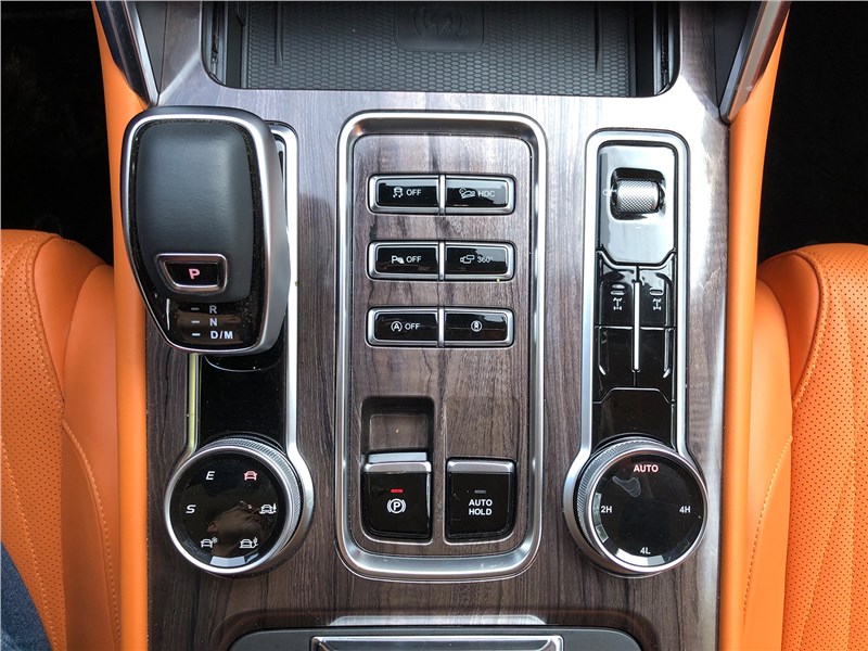 В остальном у V9 – тот же плавный, но уверенный старт, в котором ощущается помощь электромотора, да и вообще предсказуемая достаточная тяга силовой установки, которая делает управление автомобиля в самых разных режимах, от трассы до бездорожья, ровным и предсказуемым. На обороте солнцезащитного козырька с водительской стороны приклеена инcтрукция по использованию раздатки, но тут все привычно: «шайбой» на правой стороне центрального тоннеля выбираешь 2H, Auto, 4H, 4L – последний, естественно только когда коробка в нейтрали. Левая «шайба» – выбор режимов движения: Eco, Normal, Sport, Sand, Snow, Off-Road. У «автомата» TUNLAND V9 есть ручной режим, можно играть подрулевыми переключателями.