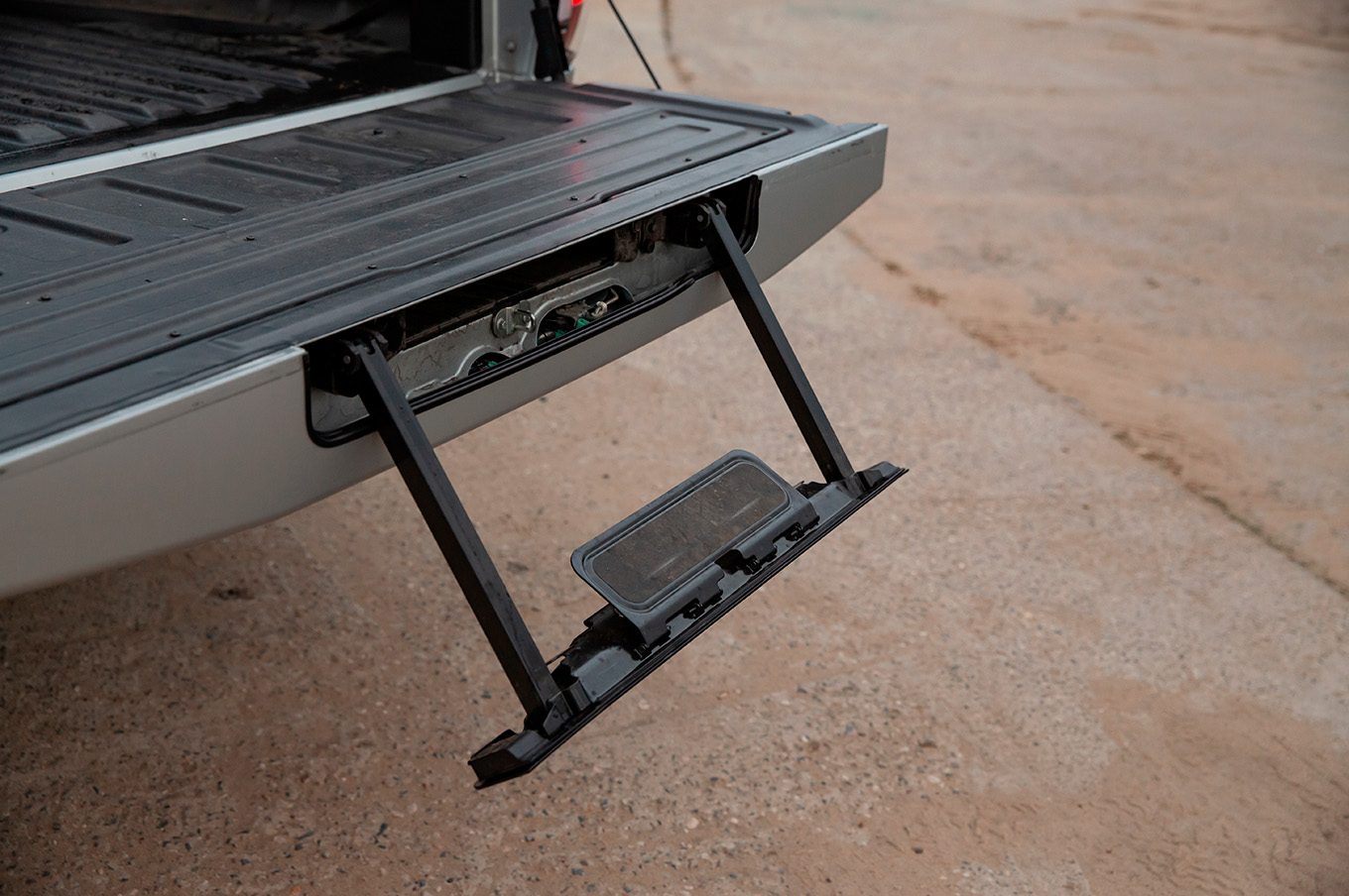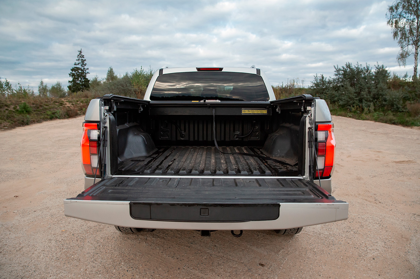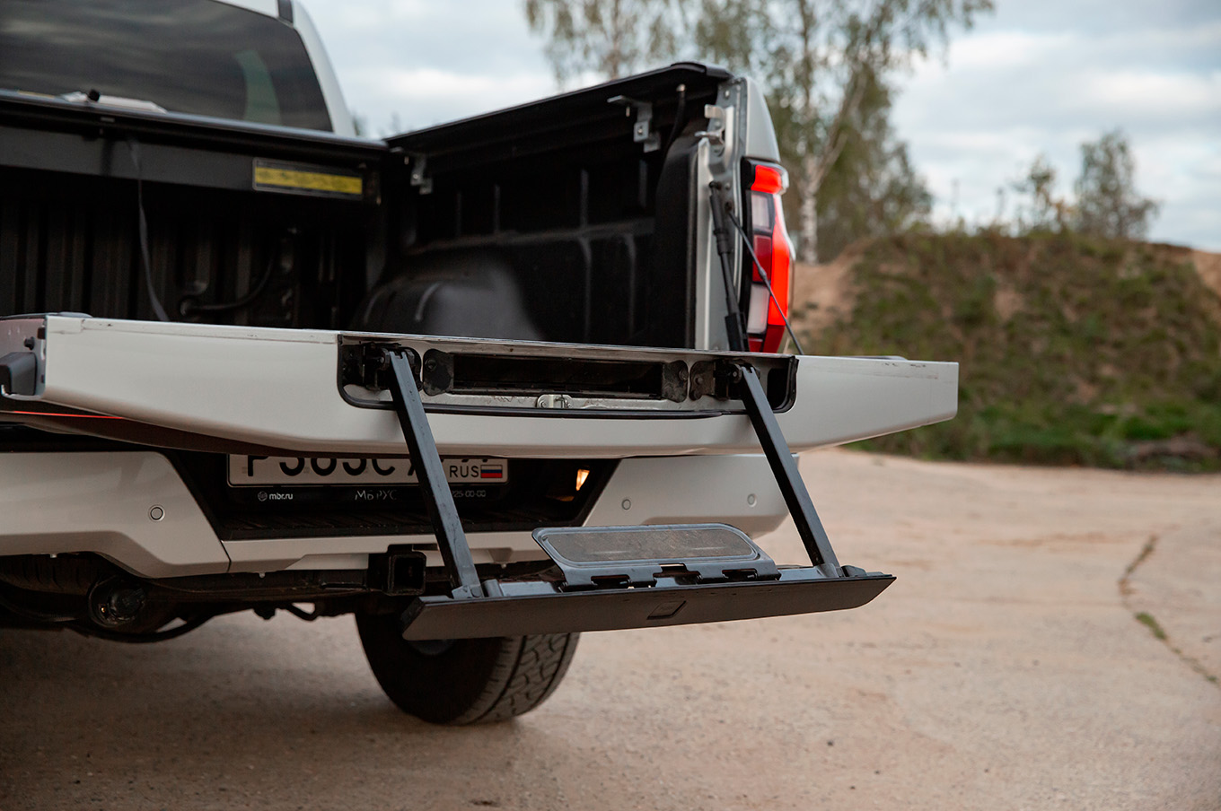 Длина грузового отсека — 157 см, ширина — 165 см (хотя между колесными арками 124 см), забираться в него помогает встроенная в задний борт ступенька, а под ним прячутся фаркоп, буксировочный крюк и запаска.