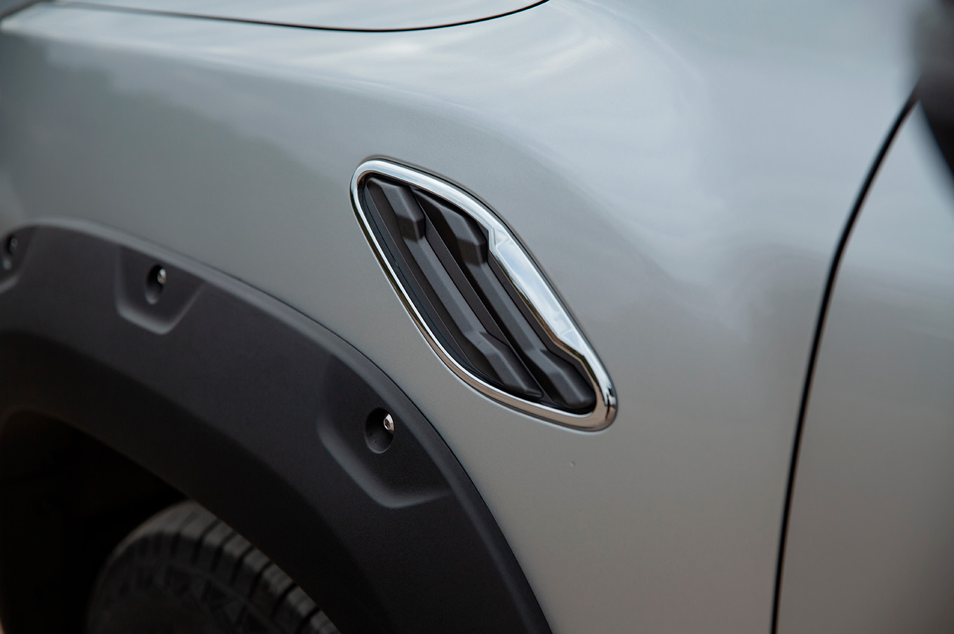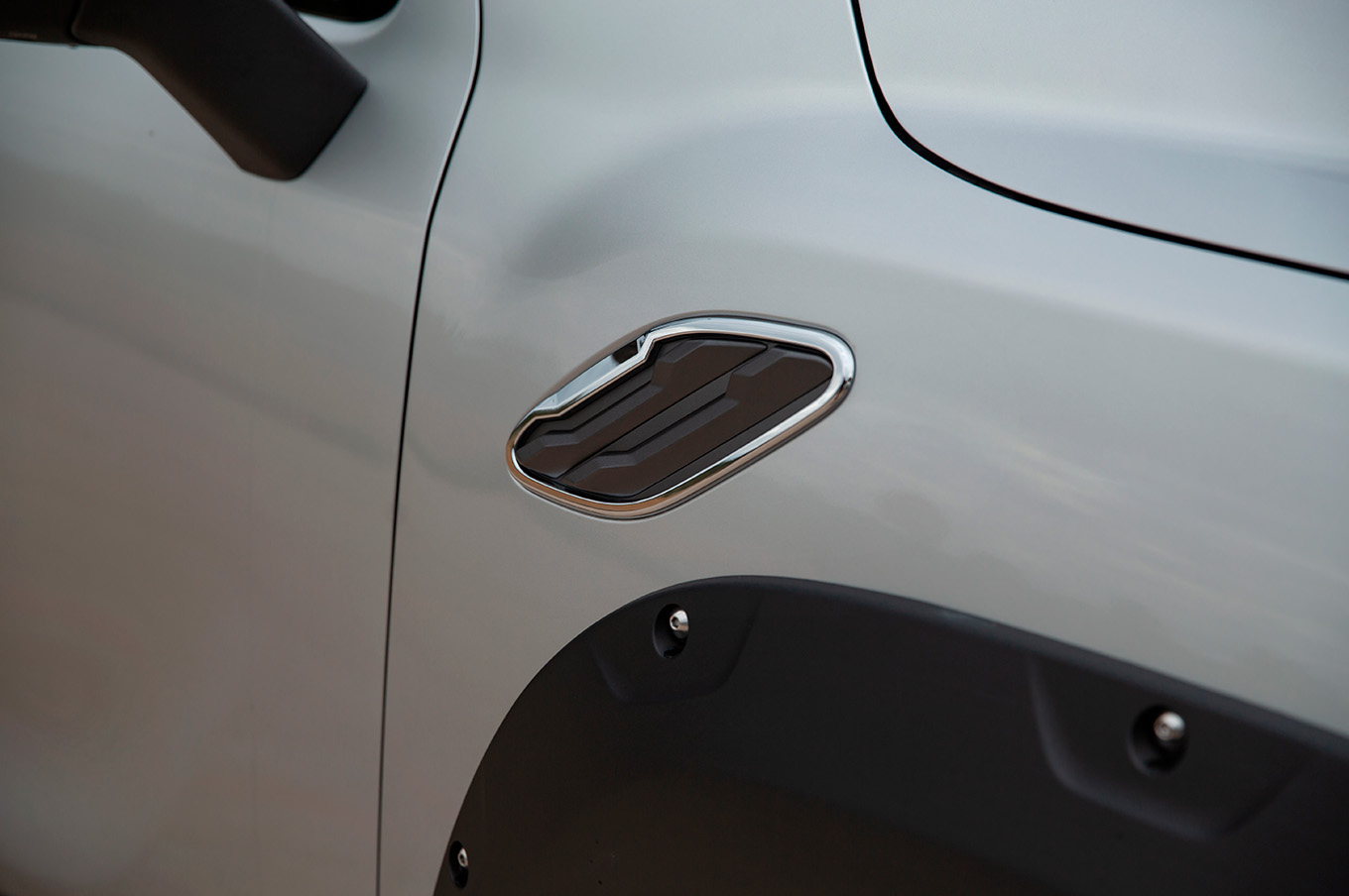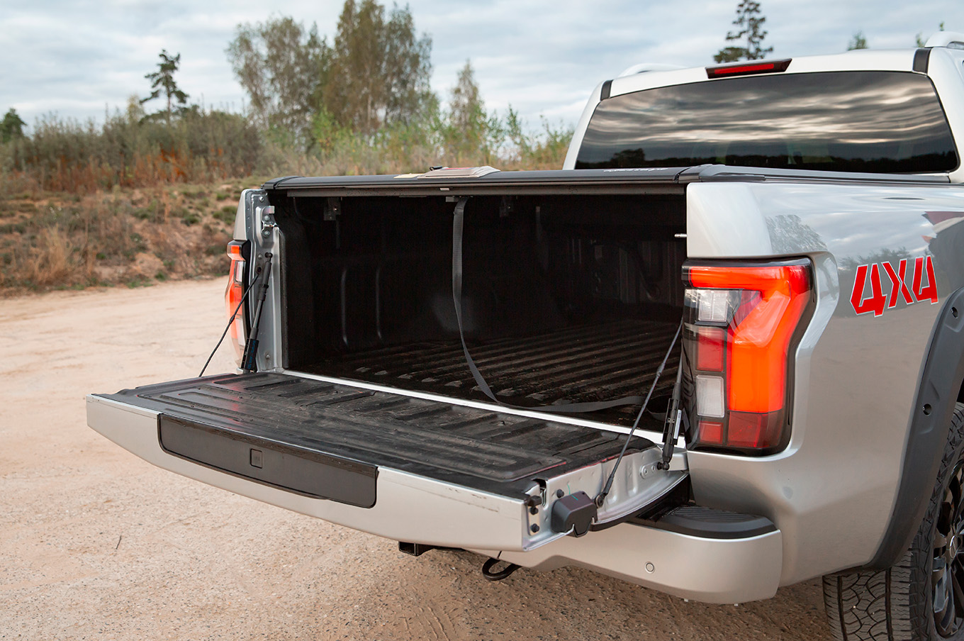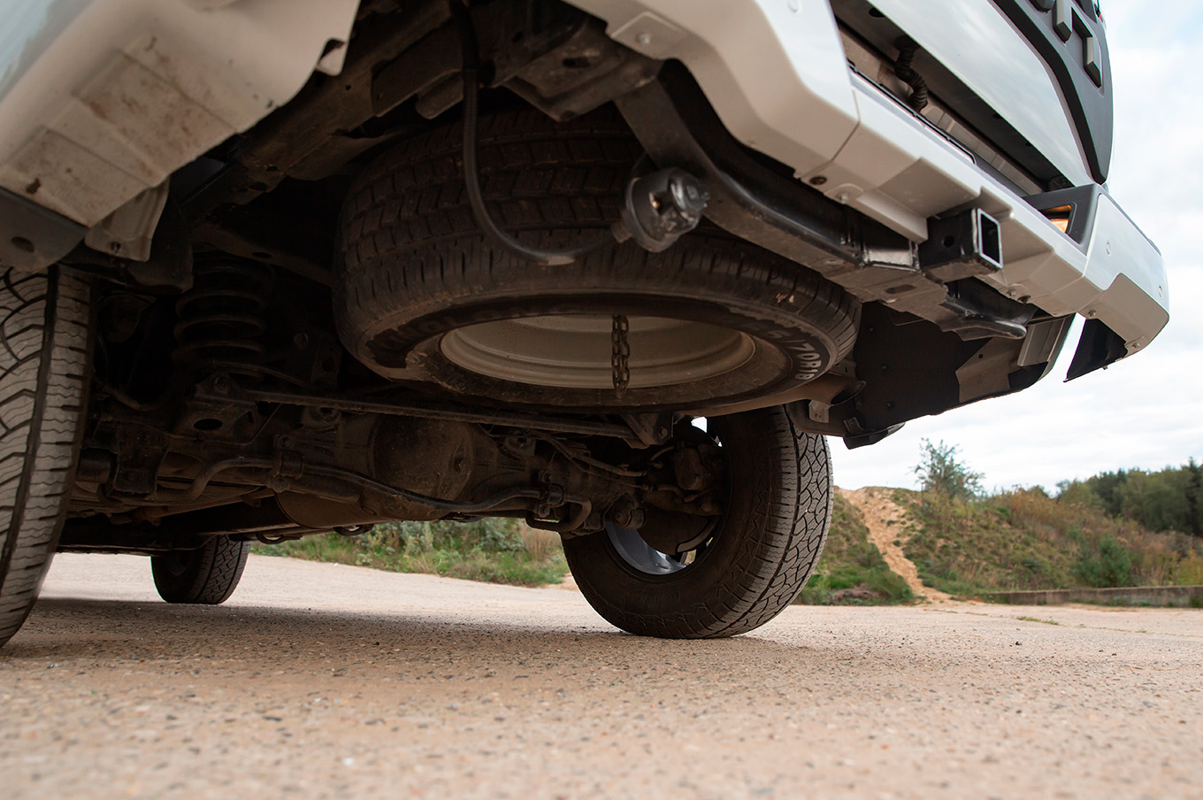 Длина грузового отсека — 157 см, ширина — 165 см (хотя между колесными арками 124 см), забираться в него помогает встроенная в задний борт ступенька, а под ним прячутся фаркоп, буксировочный крюк и запаска.
