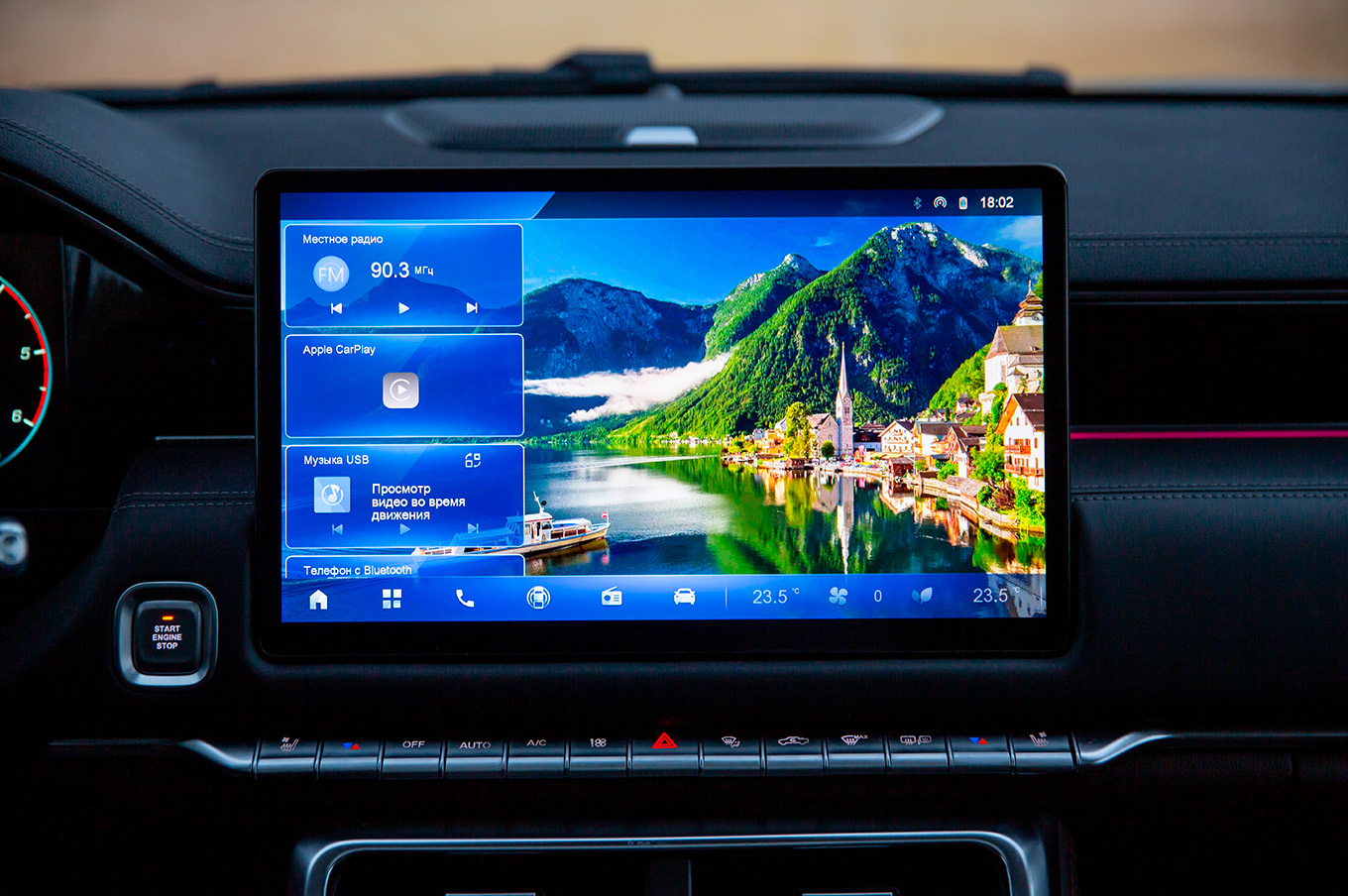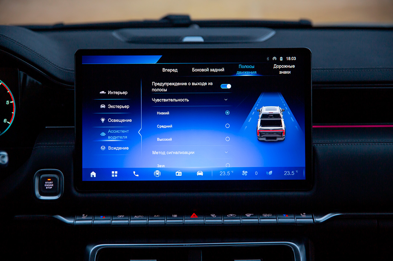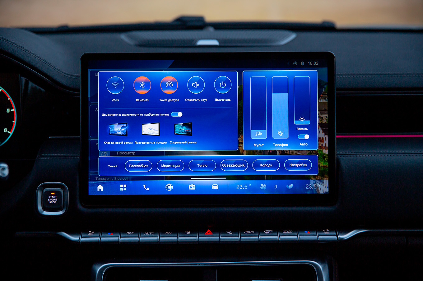 Дизайн приборки подозрительно напоминает Mercedes-Benz (даже раздел с работой трансмиссии тут называется 4Matic), но обе шкалы и центральную секцию можно настраивать на свой вкус — на удивление функциональный и удобный интерфейс.