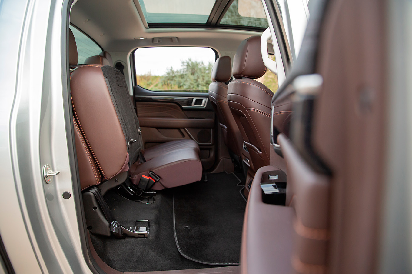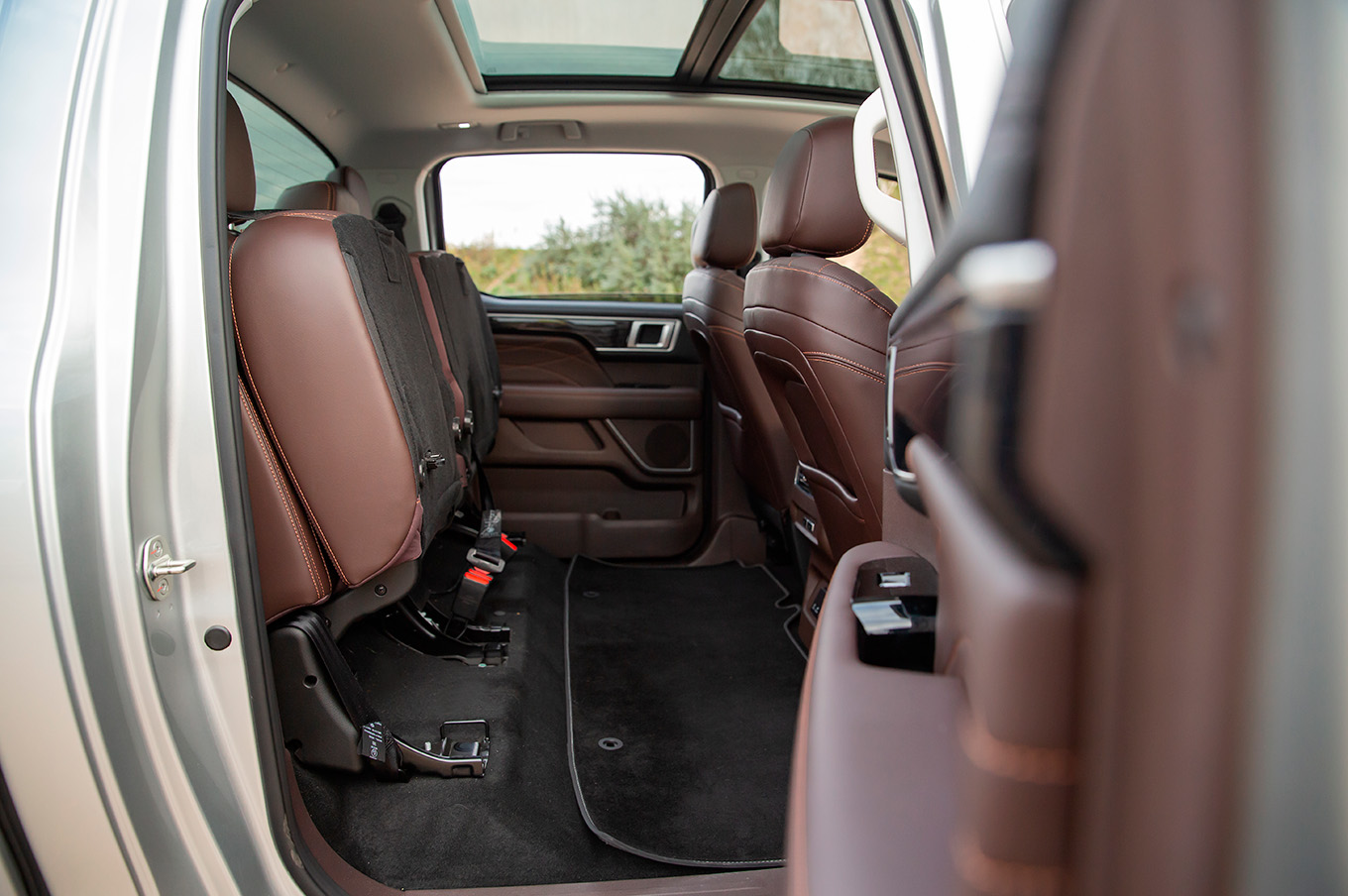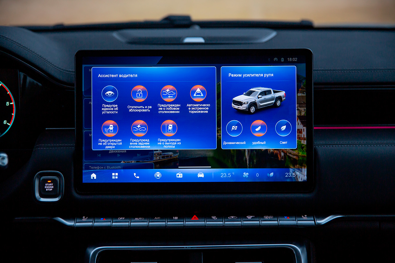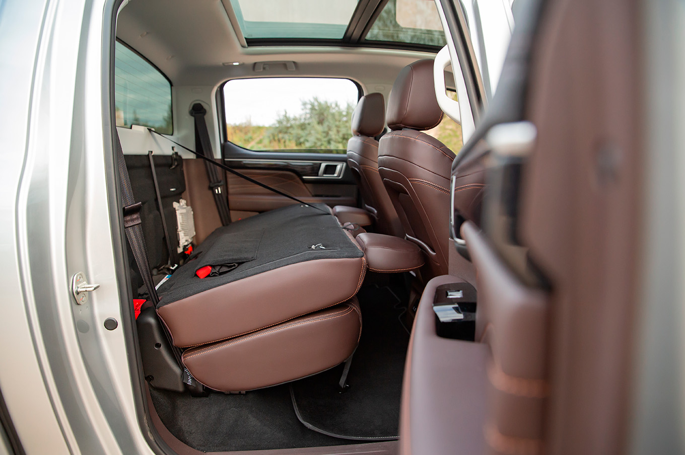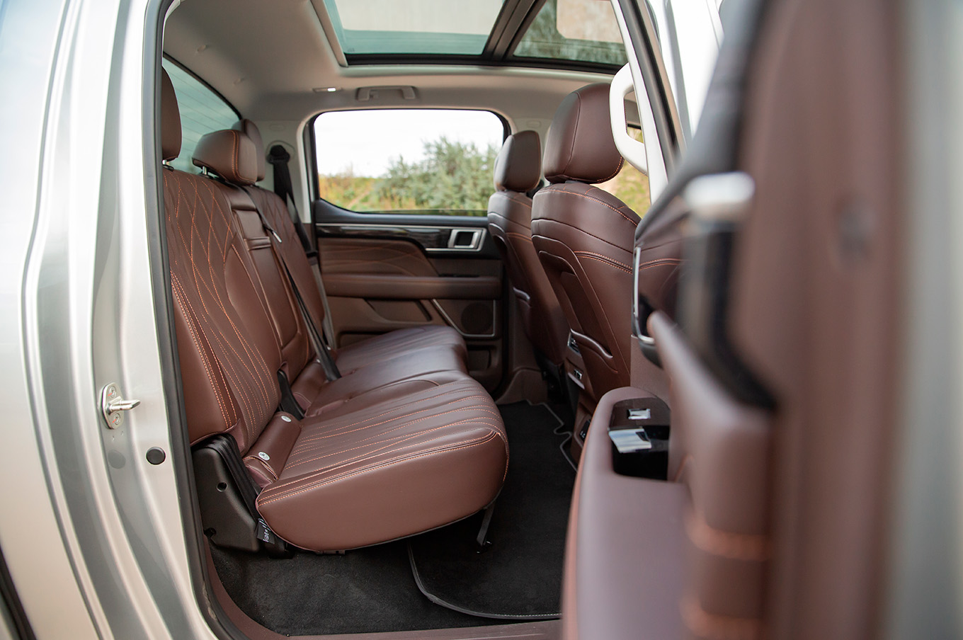 Салон хорош: неплохой кожзам красивого цвета, гламурная контурная подсветка, экраны приборки и медиасистемы дополнены настоящими кнопками. Комфортное положение за рулем я подобрал сразу, да и на заднем диване сидеть удобно, что для пикапов редкость.