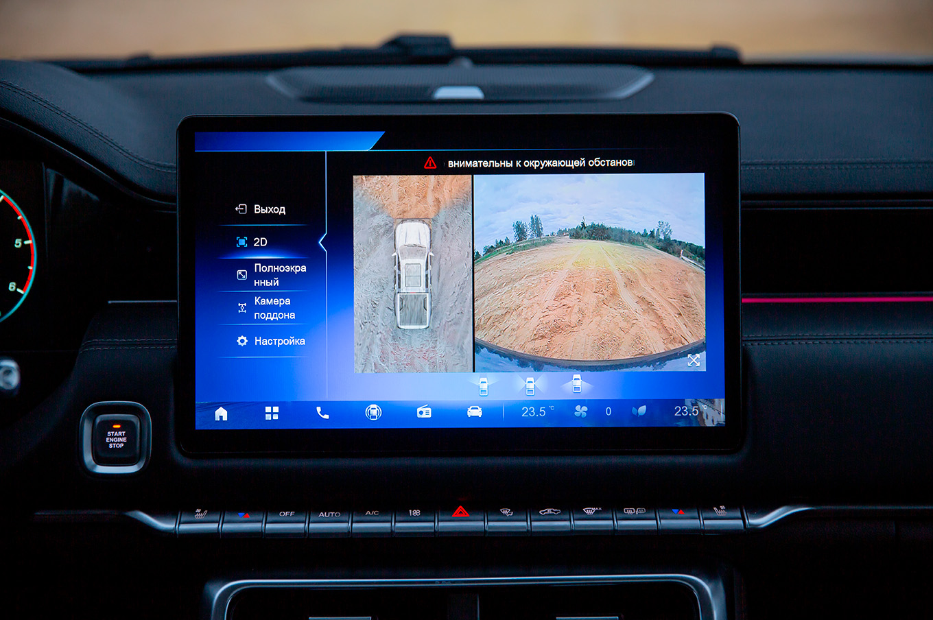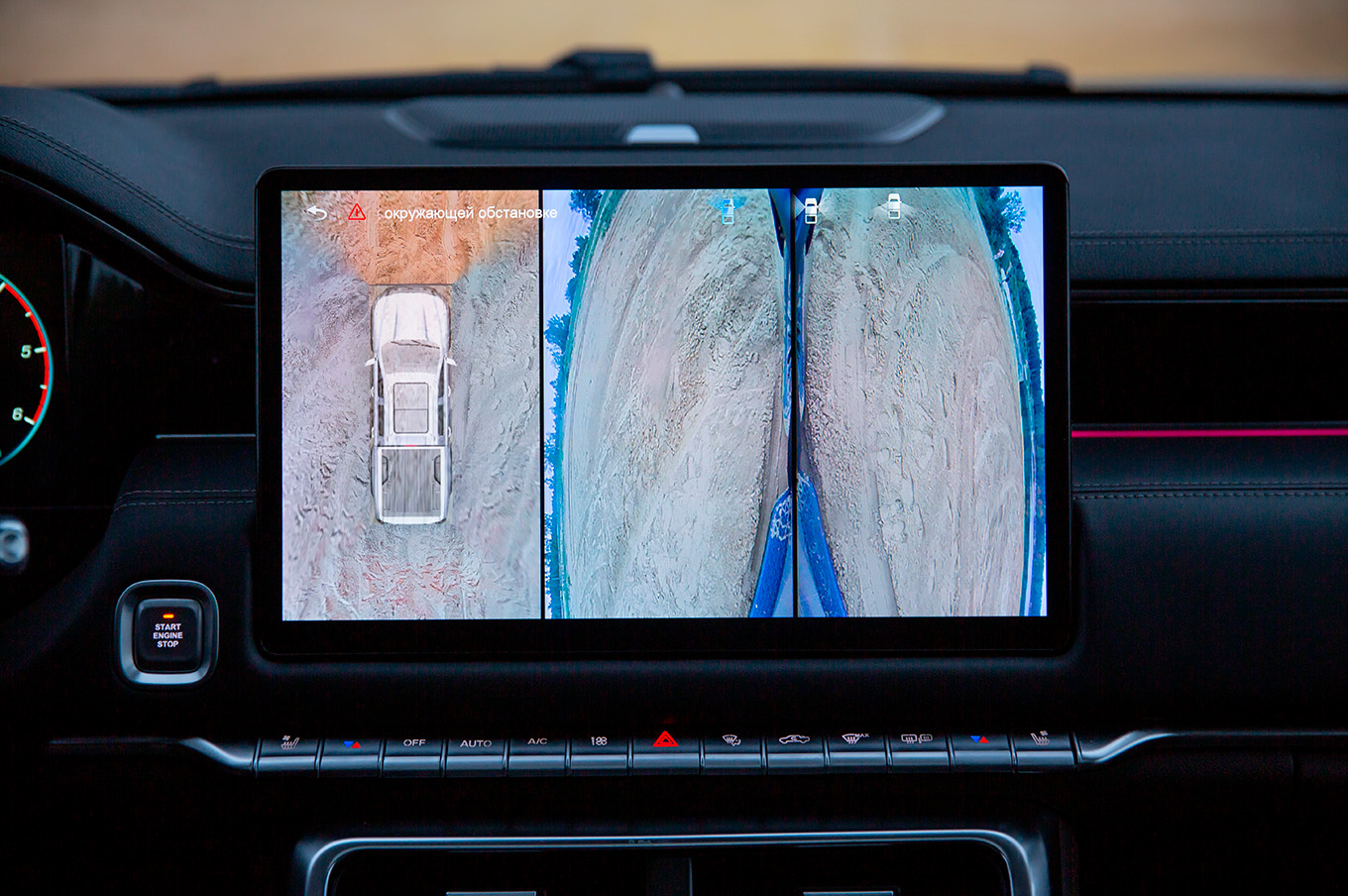 Экран медиасистемы диагональю 14,6 дюйма хорошо подходит для крупных картинок с камер кругового обзора, но в остальном интерфейс у медиасистемы немного бестолковый. Пульт 2-зонного климат-контроля, подогрева и вентиляции сидений тут, к счастью, продублирован на кнопках, так что в экран приходится залезать нечасто.