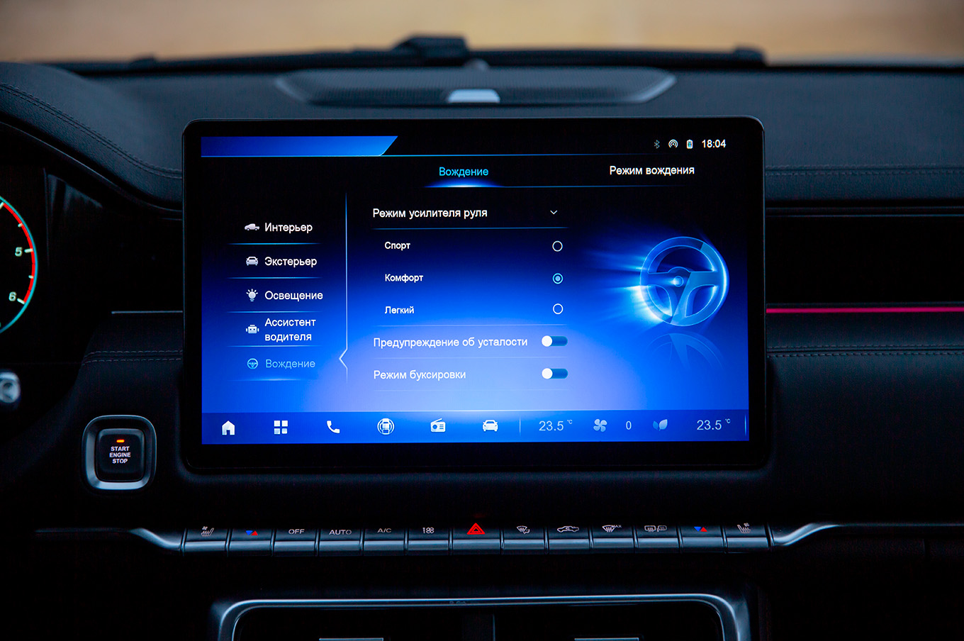 Стартер-генератор тут оказался к месту. Во-первых, с ним не по-грузовому мягко работает старт-стоп (лучше, чем на многих бензиновых кроссоверах из Китая), который быстро возвращает турбодизель к жизни после короткой остановки на светофоре. Во-вторых, с ним отклики на нажатие педали газа кажутся мгновенными — почти как на электромобиле.